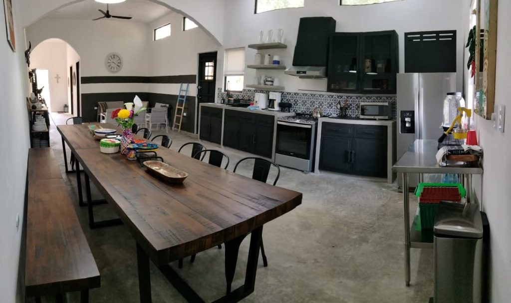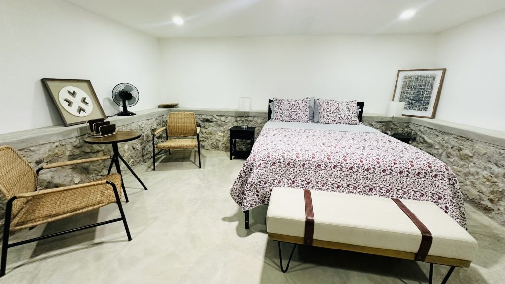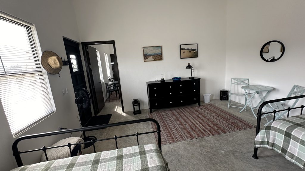 - Large bedroom with two queen size beds with private indoor access to the restroom and mini kitchen